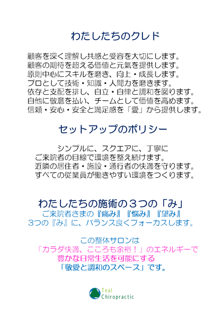 2004年に創業された武蔵小山整体院(当初はキュアステーション)わたしが院長に2007年に着任して以来幾度となくミッションやヴィジョインを書き綴って参りました。のべ30人のスタッフさんとともに學びともに励みながら磨いてきた文章です。ことがあるごとに良い着想を得るたびにすこしづつ書き換えたり継ぎ足して今この形になっています。